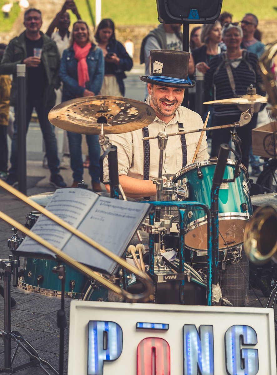 Née à Bayonne, PONG Orchestra est une fanfare de rue pas comme les autres : un mélange détonant où les cuivres se frottent aux riffs de guitare saturée. Douze musiciens animés par l’envie commune de faire vibrer le public, de la plus étroite des ruelles aux scènes des festivals. A chaque prestation, PONG Orchestra déchaîne une énergie brute, festive et fédératrice. La rue explose sous un tsunami de décibels, un mur de son qui se vit autant qu’il s’écoute.
